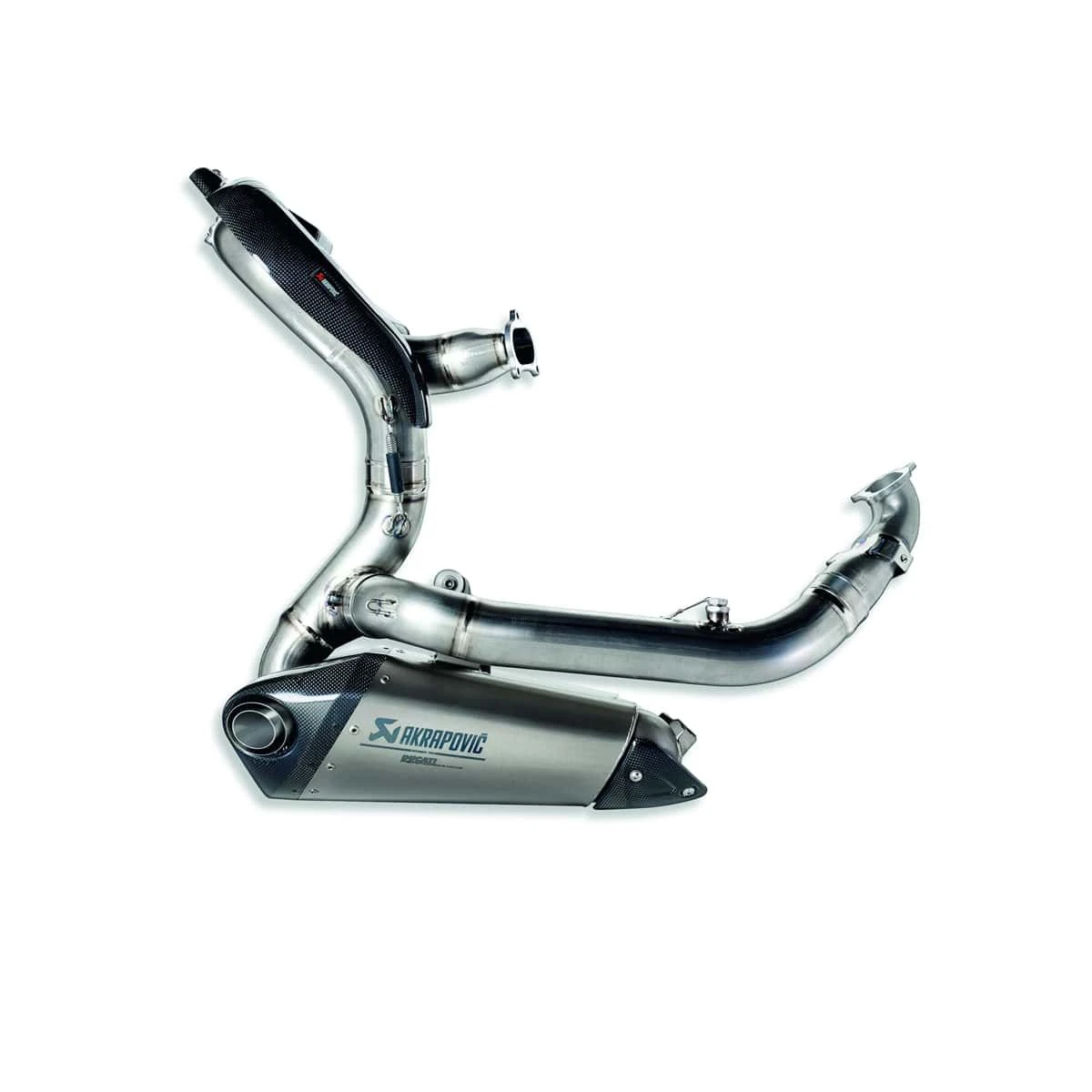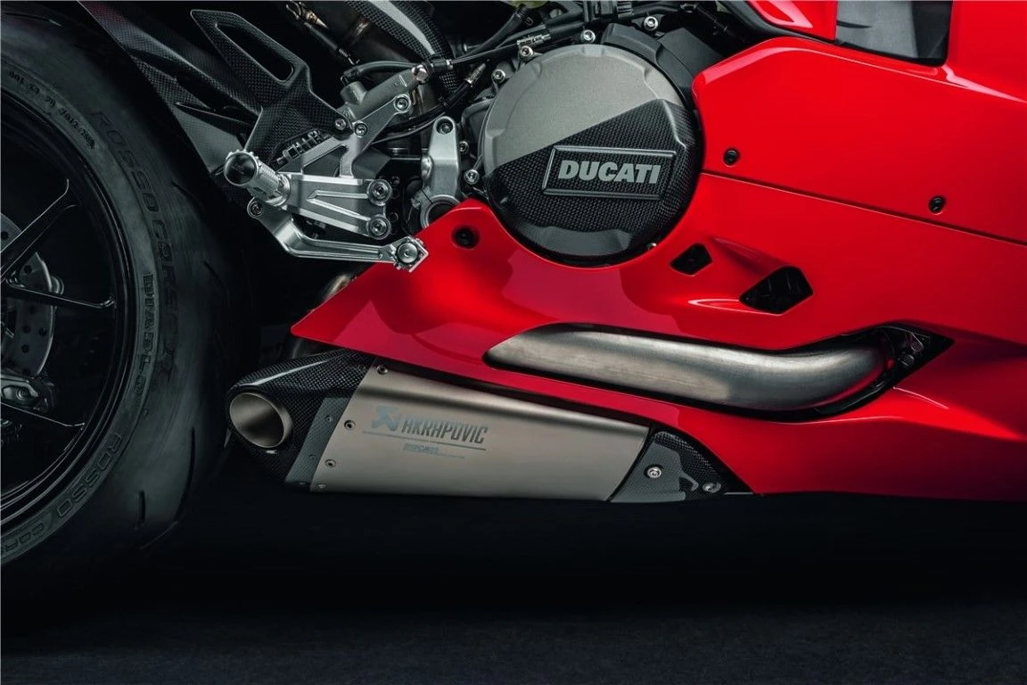 Een nieuw, zeer krachtig uitlaatsysteem is gecreeerd dankzij het bekwame vakmanschap van Akrapovič in combinatie met het Ducati-ontwerp, exclusief voor Panigale. Het is volledig vervaardigd in speciale titaniumlegering en TIG-lassen (Tungsten Inert Gas), om de hoogste lichtheid en weerstand tegen hoge temperaturen te bieden. Het is uitgerust met een speciale motorkaart om aan specifieke race-eisen te voldoen en maximale prestaties te garanderen. De al uitstekende gewicht / vermogensverhouding van de supersportmotor is verder verbeterd door dit exclusieve accessoire, voor adembenemende acceleratie en sprint.