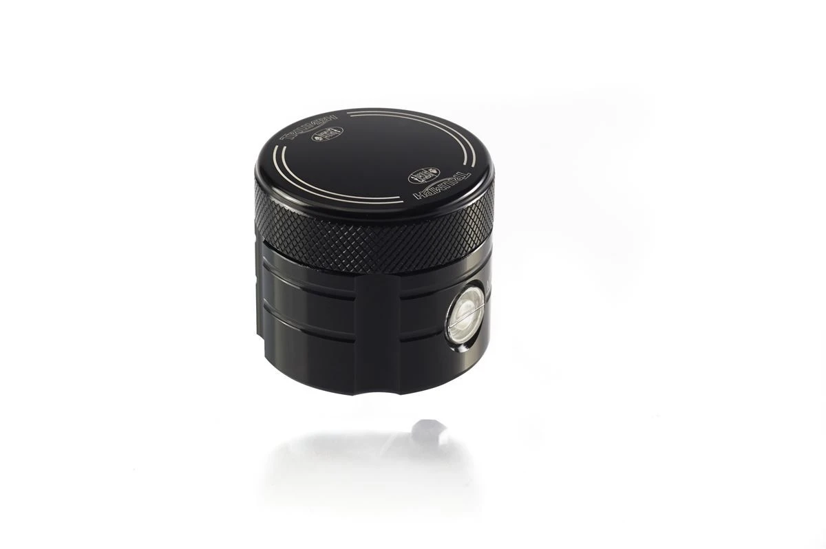 Een CNC-bewerkt frontreservoir, ontworpen als vervanging van het originele onderdeel. In een ergonomisch design met gekartelde dop en geïntegreerd kijkglas. Voorzien van een lasergeëtste merkaanduiding en een geanodiseerd zwarte afwerking.
